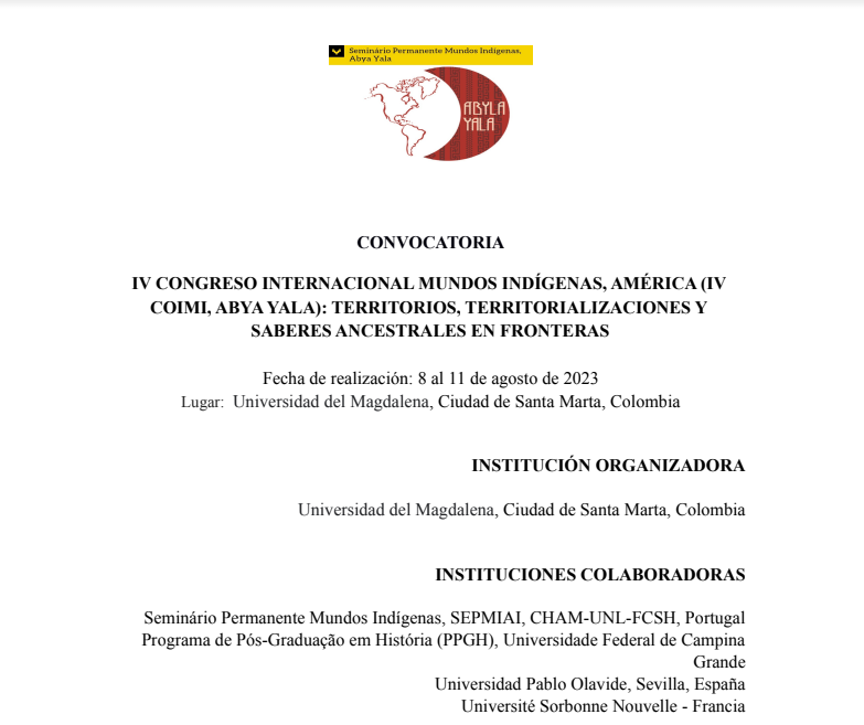 El IV COIMI - ABYA YALA, que se llevará a cabo en la Universidad del Magdalena, Santa Marta, Colombia, pretende ser un espacio donde podamos ampliar los diálogos entre investigadores indígenas y no indígenas, donde se abran posibilidades de nuevas propuestas epistemológicas, políticas, decoloniales e interdisciplinarios sobre la temática general del IV Congreso Internacional Mundos Indígenas: Territorios, Territorializaciones y Saberes Indígenas.
