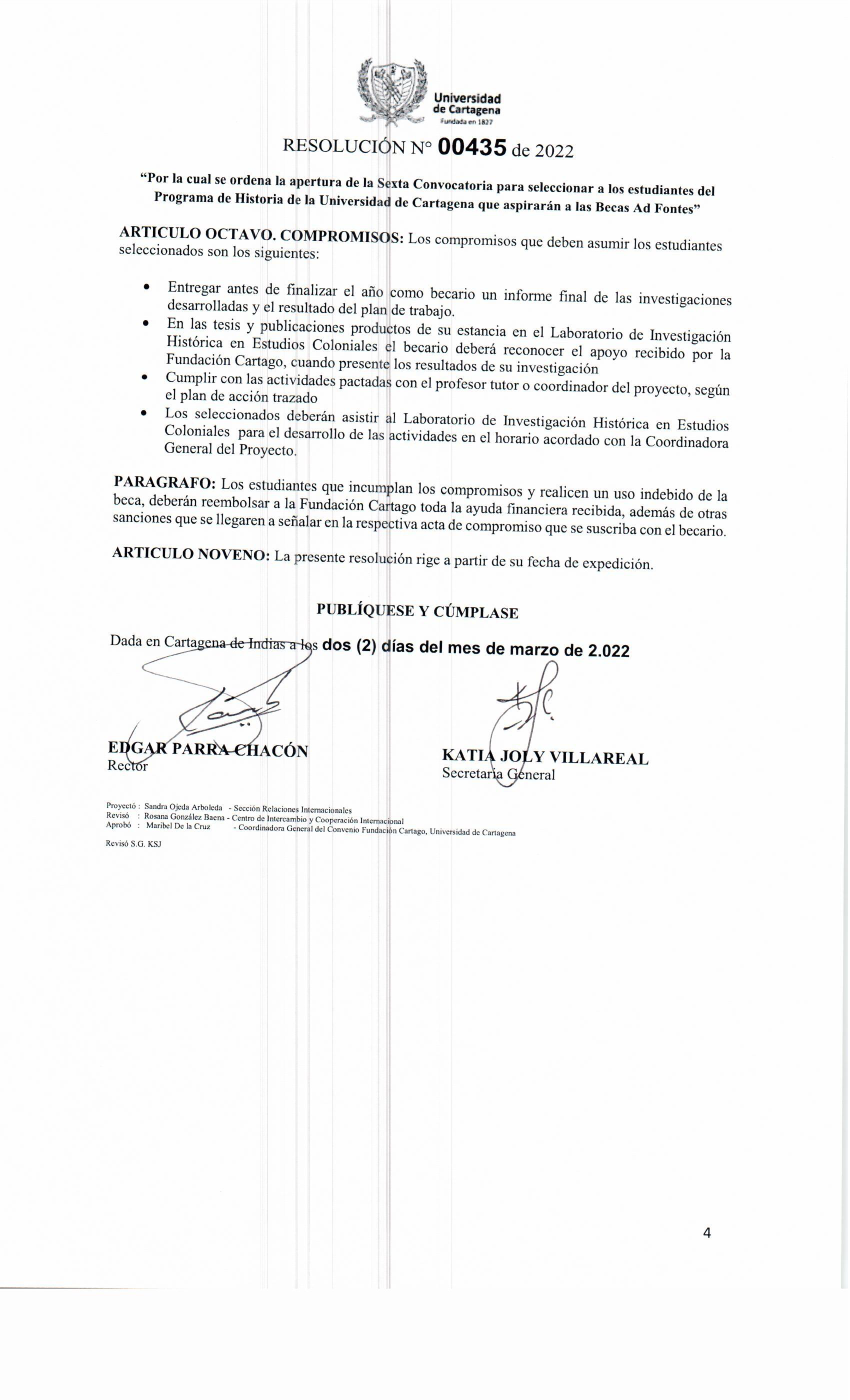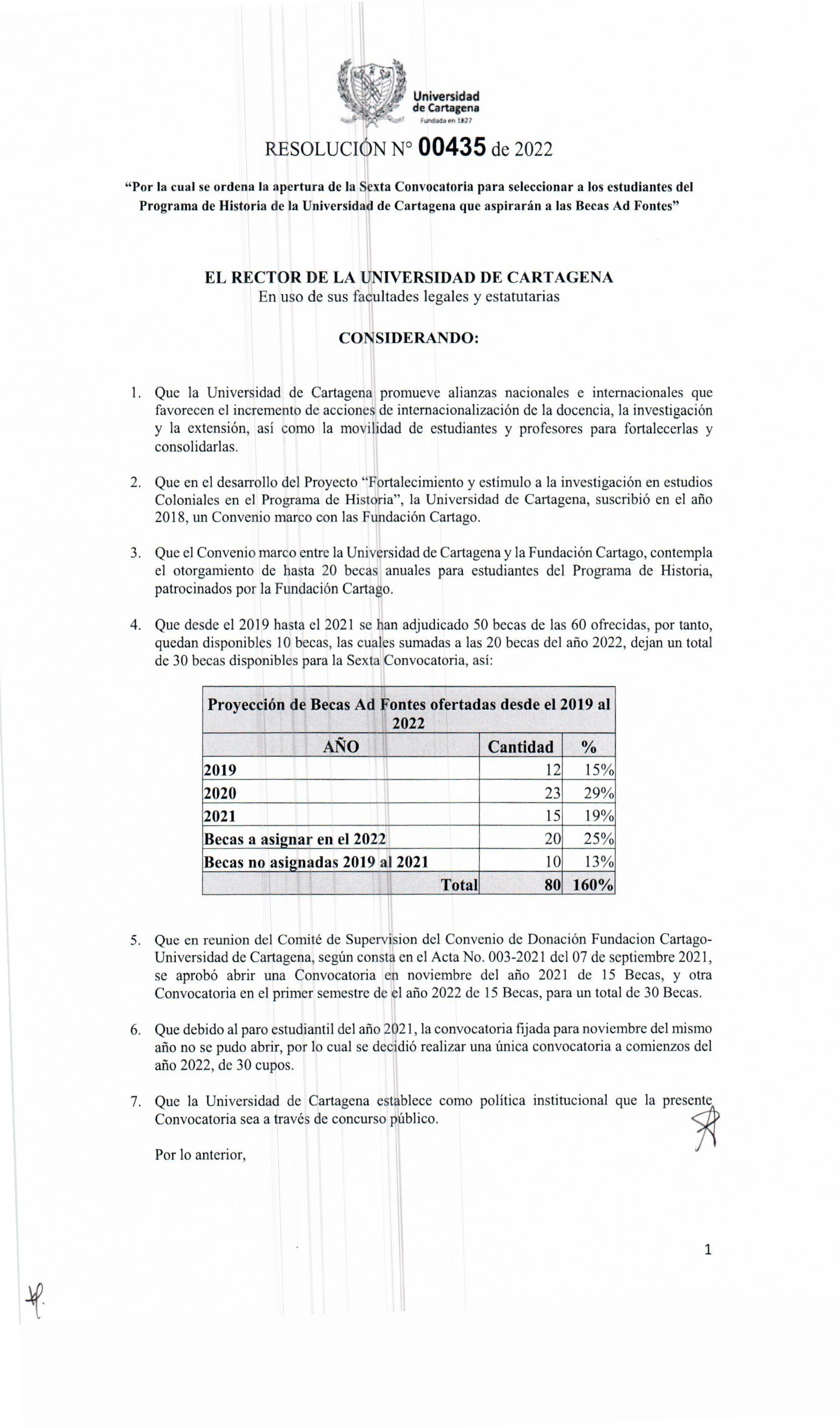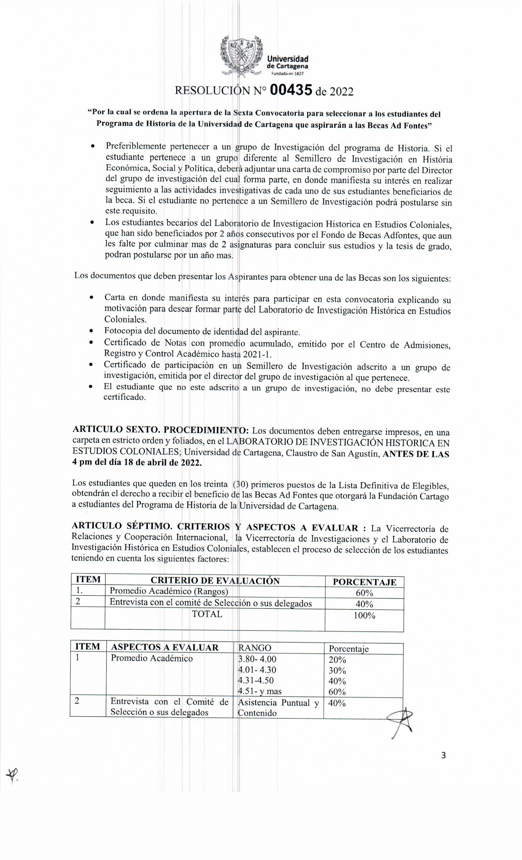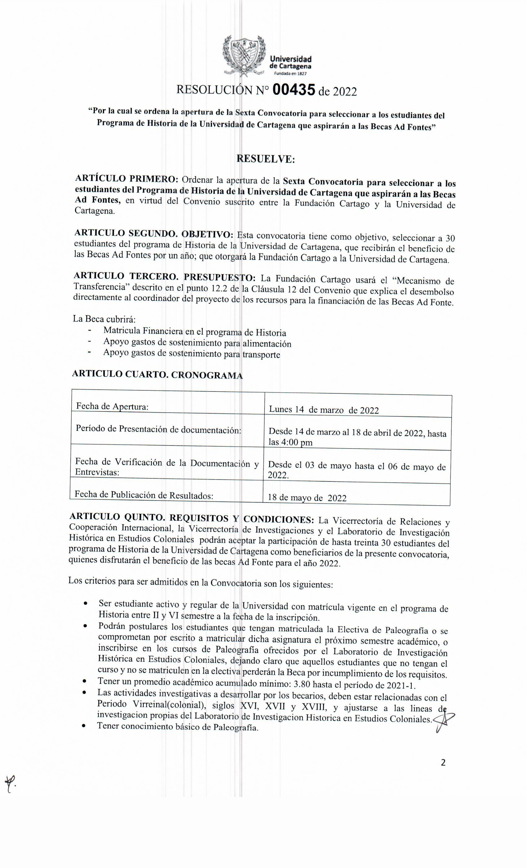 "Por la cual se ordena la apertura de la Sexta Convocatoria para seleccionar a los estudiantes del Programa de Historia de la Universidad de Cartagena que aspirarán a las Becas Ad Fontes"