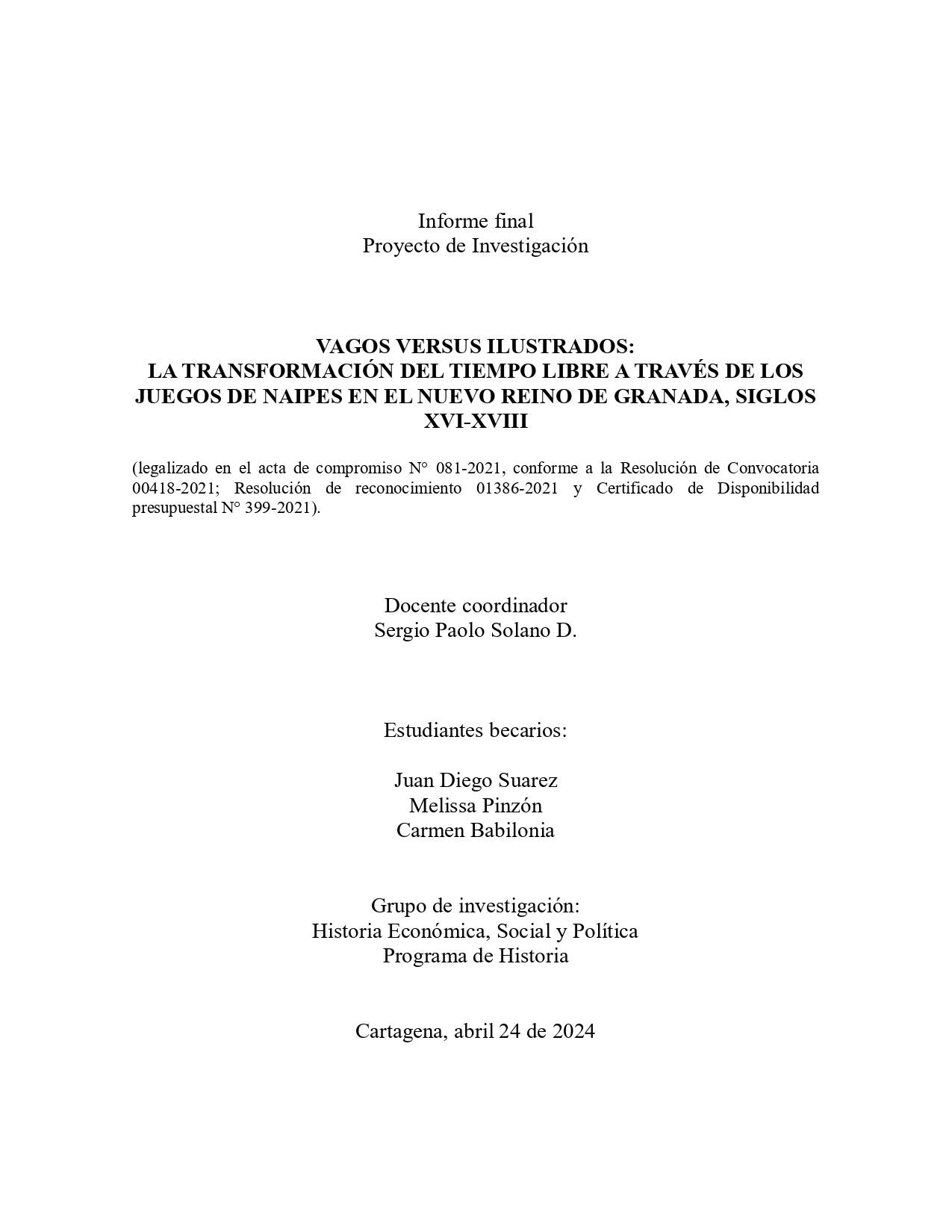 A continuación, se presentan los resultados de investigación del proyecto “VAGOS VERSUS ILUSTRADOS: LA TRANSFORMACIÓN DEL TIEMPO LIBRE A TRAVÉS DE LOS JUEGOS DE NAIPES EN EL NUEVO REINO DE GRANADA, SIGLOS XVI-XVIII” ejecutado y legalizado en el acta de compromiso N° 081-2021, conforme a la Resolución de Convocatoria 00418-2021; Resolución de reconocimiento 01386-2021 y Certificado de Disponibilidad presupuestal N° 399-2021.