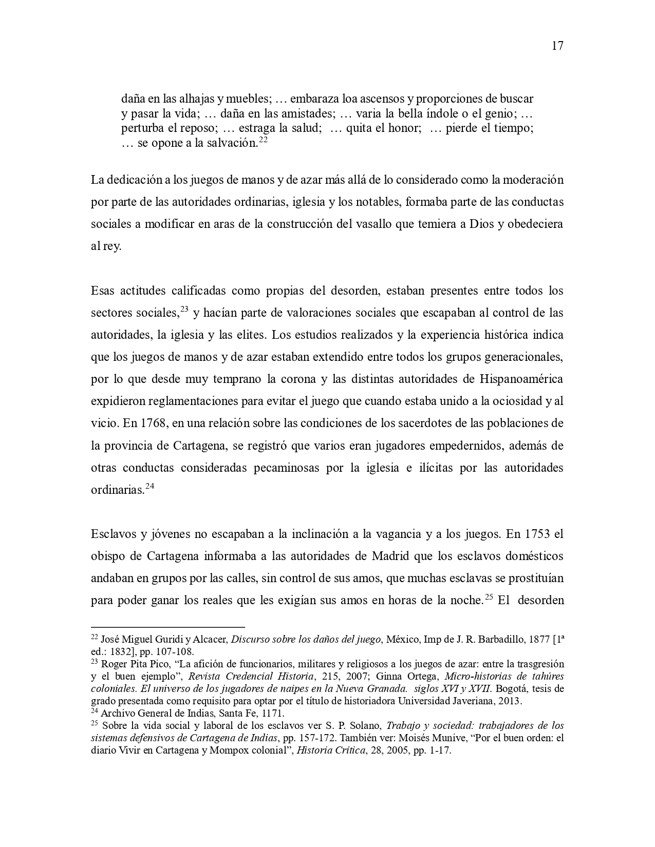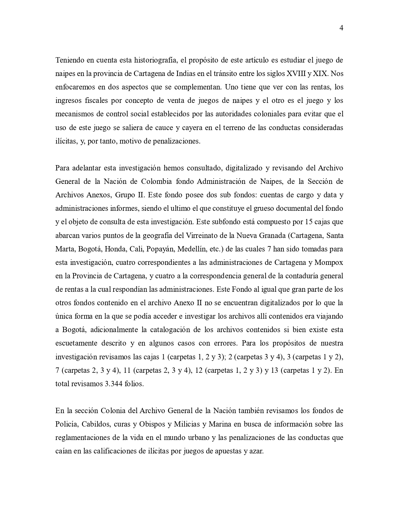 Por ello, esta investigación se ha propuesto no solo entender cómo los naipes articularon a la ciudad en un circuito más amplio de consumo a nivel regional (el Nuevo Reino de Granada) y global (la monarquía hispánica y los imperios circundantes) sino mostrar cómo se construyeron y vivieron los espacios de sociabilidad alrededor del juego en la Provincia de Cartagena, aportando así al entendimiento de las dinámicas sociales y económicas que   nos han permeado como sociedad Cartagenera, Nacional y Caribeña